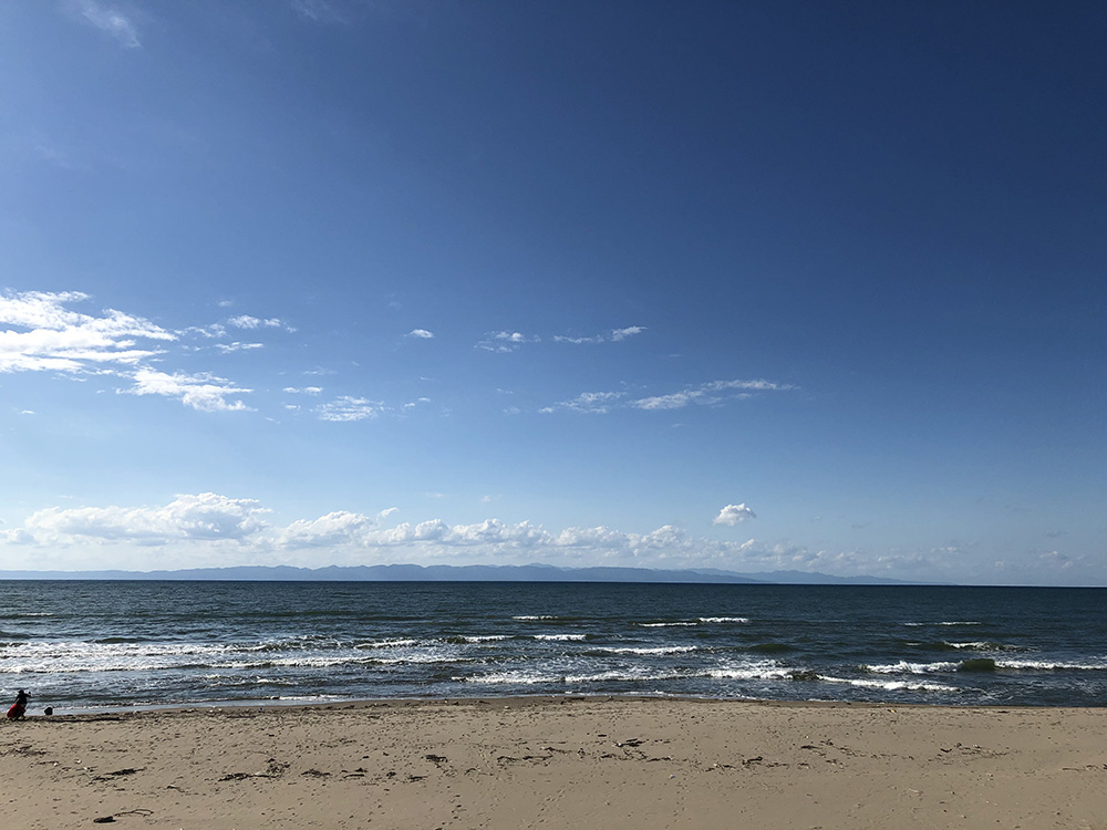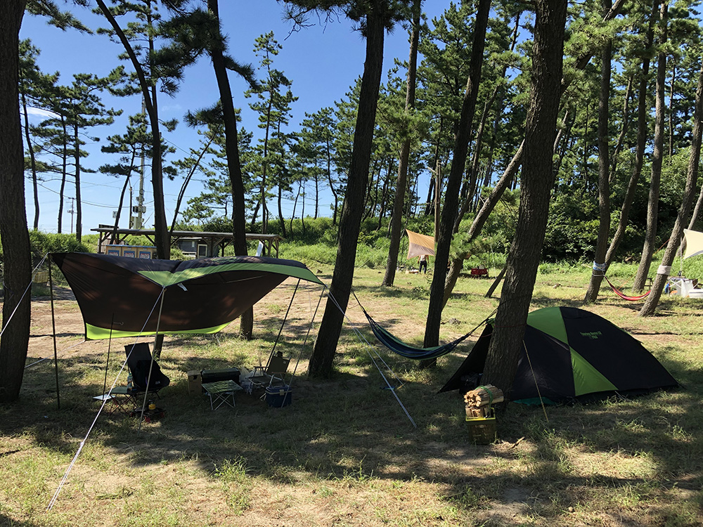 海のすぐ近くのキャンプ場。写真の向こうに見える島が前回キャンプに訪れた佐渡島。今回は人が少なく過ごしやすくてよかった。ずっと袋の中で待機してたハンモックがようやく活躍してくれた! ハンモックはいいぞ。