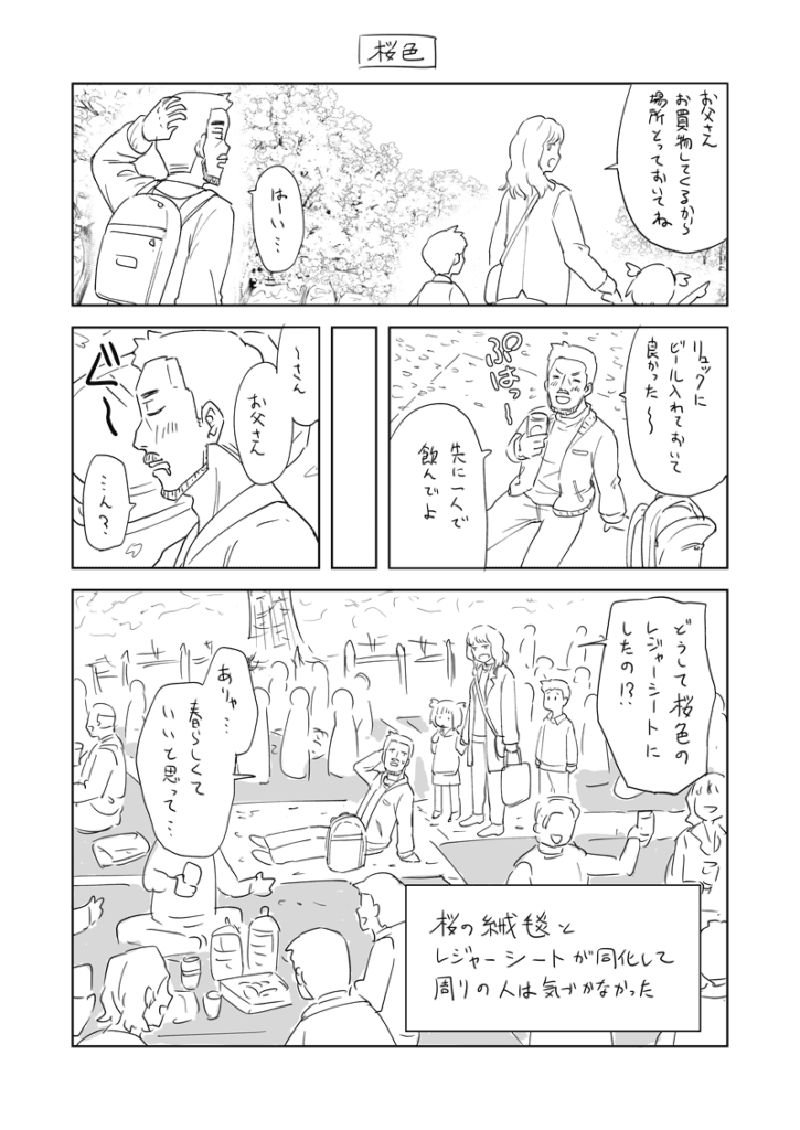 花見の絵を描いてたら花見したくなるね…。ビールと焼き鳥と焼きそばと…。