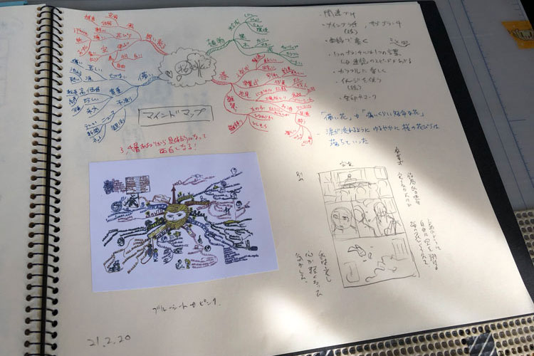 マインドマップは似たようなものを昔どこかで見た覚えがあるので、たまに試してたこともあって使いやすい。枝1本目を1層とすると3、4層あたりから単語が具体的になってきて面白くなってくる。桜のお題の3つ目と4つ目はこのマインドマップの「卒業式」「別れ」「鳥」「空」「花びら」「花見」「お酒」「ブルーシート」「場所とり」あたりの単語から連想した漫画になってる。