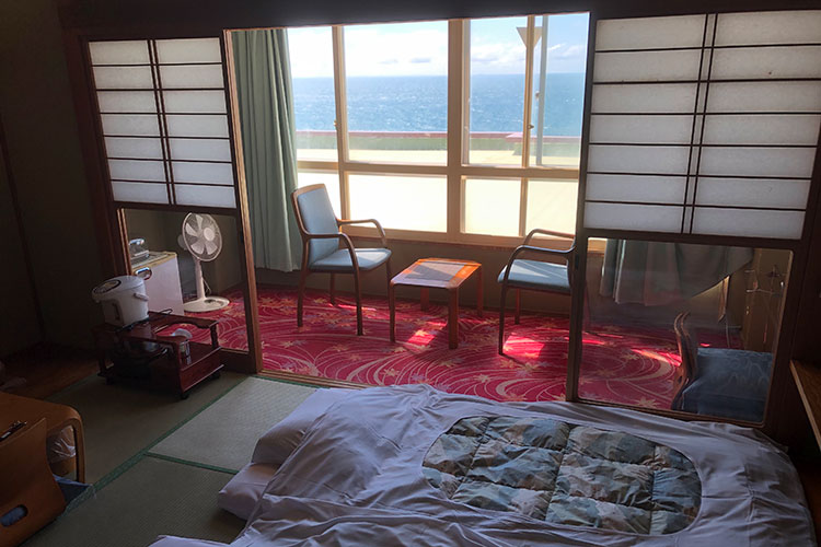 古い旅館だったので冷房の効きが弱くてどうなることかと思っていましたが、夜にはちゃんと冷えてくれて安心しました。海辺に立って波の音を聞くのが心地よかったですね、暑かったけど…。