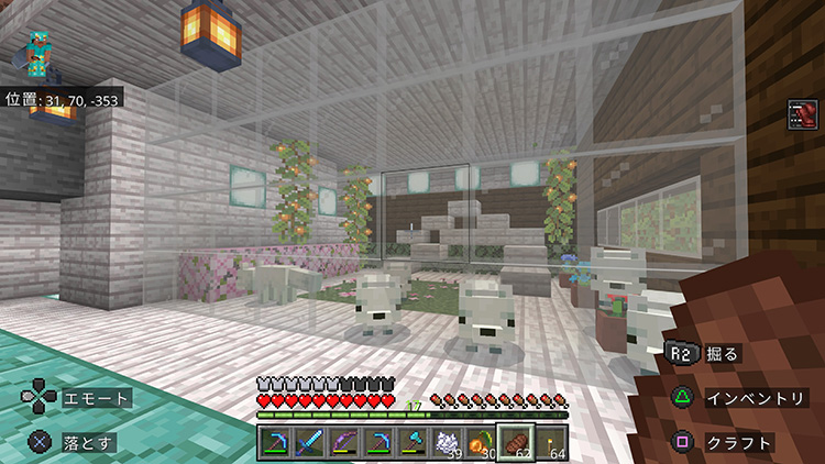 マイクラ、動物Mobはそんなに拠点に連れて行かないんだけど、白キツネを発見したらあまりに可愛くて連れて帰って繁殖させた。場所が遠かったんだけど、ネザーは通路を整備してあるので、その場でネザーゲートを作ってすでにあるゲートに接続したら簡単に連れて帰ることができた。癒しの空間ができて良かった。
